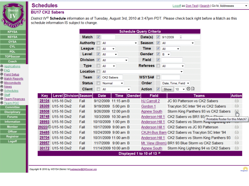 How to Acquire a Completely Filled Out Game Roster Form Printed Directly From This WebsiteThis section of this FAQ is designed to show the Coach/Staff Member how to obtain a Completely Filled Out Game Roster for a Specific Match that includes all pertinent game, Coach and Player Name & Jersey info.