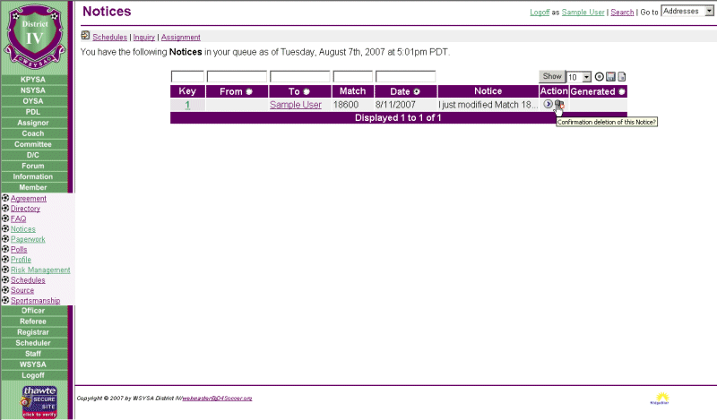 After reading a Notice and understanding what the Notice is about, they should delete it from their Notice Queue so that others (such as Club Schedulers) who are tracking this information only see those Notices that have not yet been acknowledged and deleted.